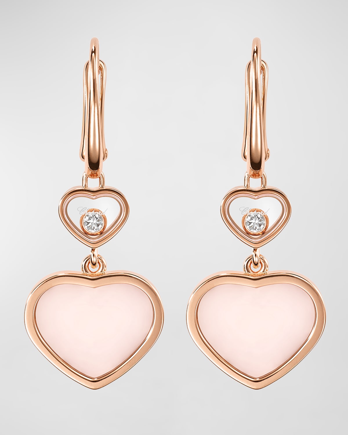 Chopard earrings from the My Happy Hearts collection 18karat rose gold with a polished finish Two seethrough windows with freefloating diamonds Heartshaped pink opal as dangles Diamond total carat weight: 0.10 Leverback closure For pierced ears Made in Germany Care Instructions: Wash with a nonchemical liquid soap. Rinse piece under water, avoiding any stones.
