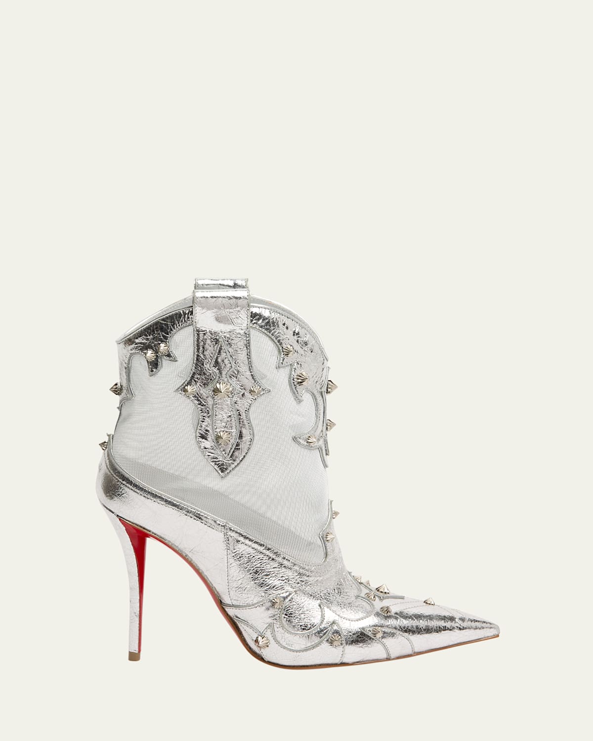 Christian Louboutin westernstyle booties in metallic leather with signature spike trim 4.00 in / 100 mm stiletto heel Pointed toe Pulltabs at collar Signature Louboutin red leather outsole Lining: Unlined Made in Italy
