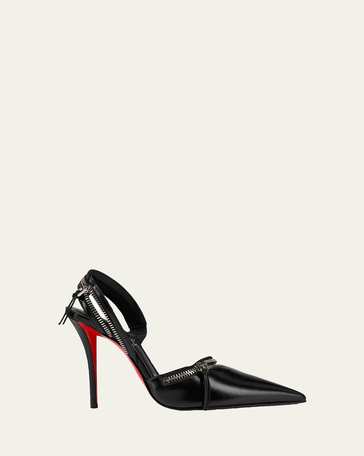 Christian Louboutin pumps in smooth calf leather with motoinspired zip details 4.00 in / 100 mm stiletto heel Pointed toe Elastic slingback strap Signature Louboutin red leather outsole Lining: Unlined Made in Italy