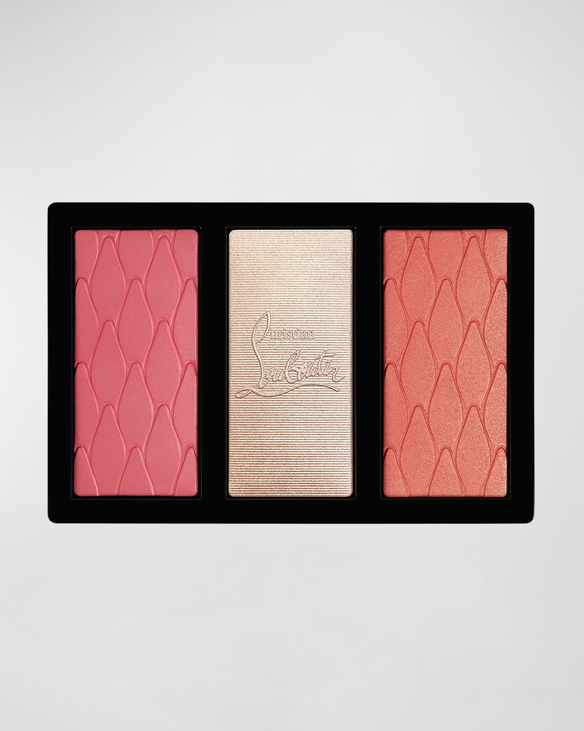 A refillable face palette with 3 shades including a highlighter and two complementary blushes for a customizable complexion. So Chick features two blush shades, a matte rose and satin coral with a light pink gold highlighter for an enhanced glow. Each refill is held within a black or red refillable case (sold separately) covered with the iconic Christian Louboutin