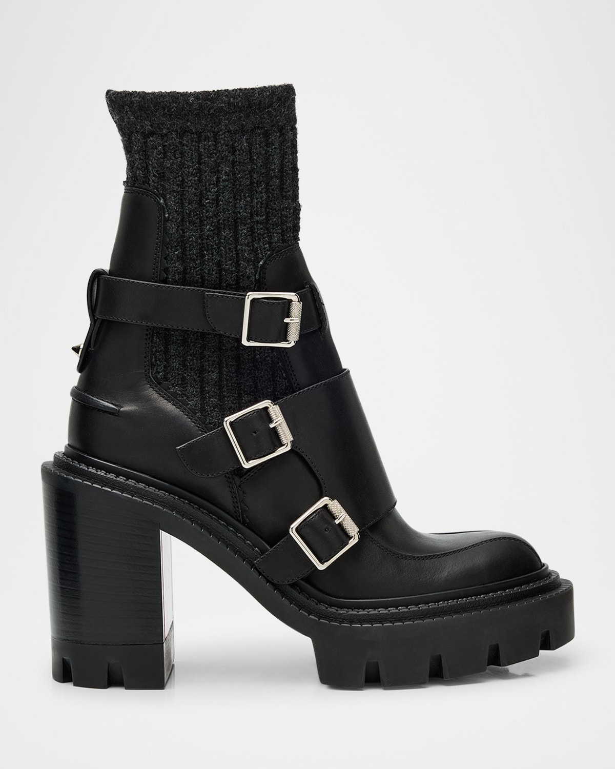 Christian Louboutin "Cortinetta" lugsole ankle boots in smooth calf leather with a comfortable ribbed socklike shaft 4.00 in / 100 mm block heel Round toe Doublebuckle monk straps Buckle ankle strap Unlined Signature Louboutin red leather outsole Made in Italy