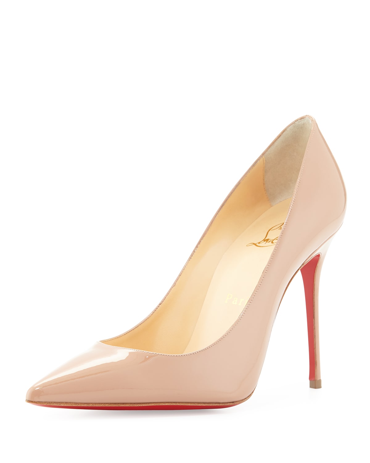 Christian Louboutin patent leather singlesole pump. 4" covered stiletto heel. Pointed toe frames lowcut vamp. Tonally topstitched collar. Leather lining and padded insole. Signature red leather sole. "Decollette" is made in Italy.