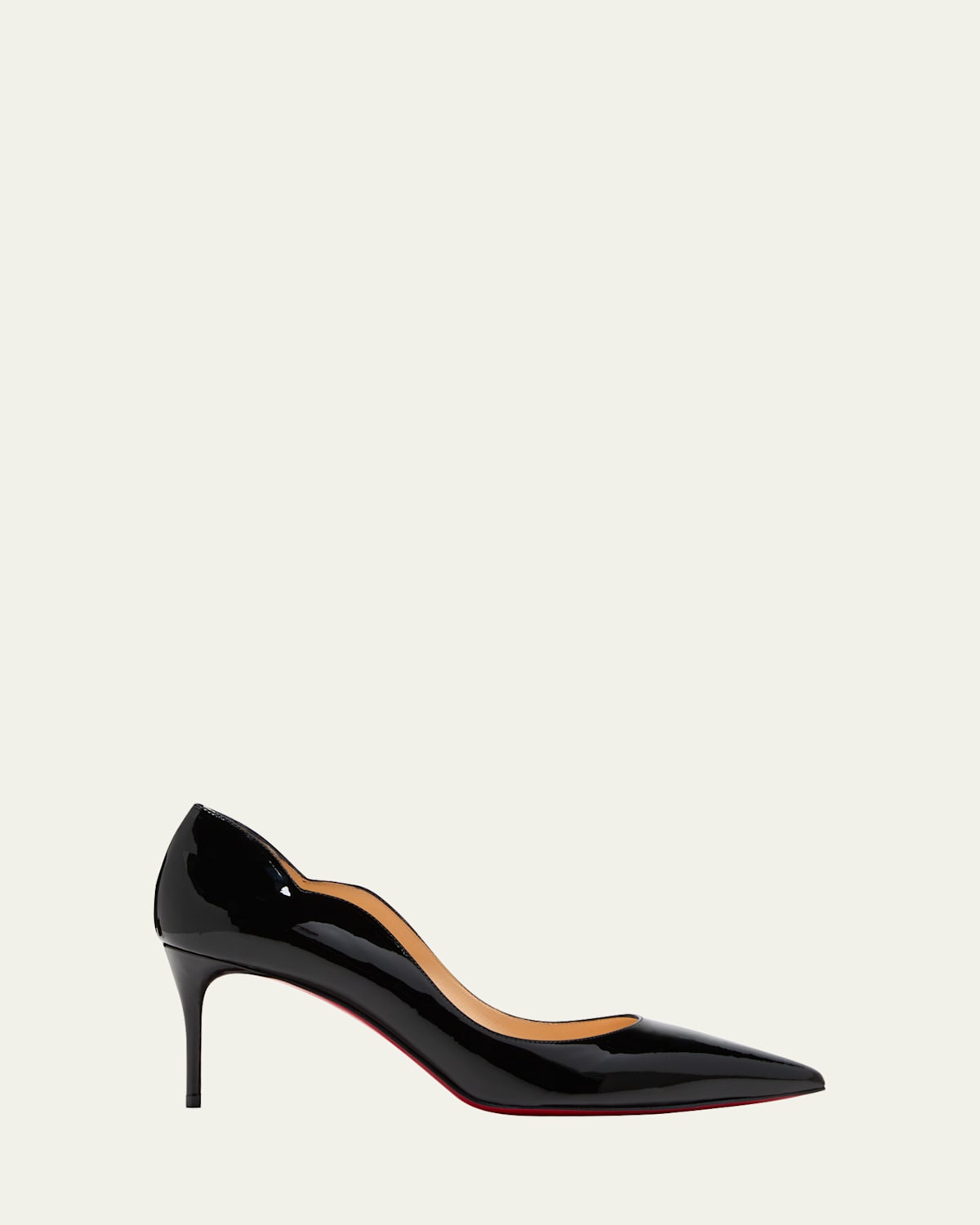 Christian Louboutin "Hot Chick" pump in patent leather, featuring curved topline. 2.75 in / 70 mm stiletto heel. Pointed toe. Slipon style. Signature Louboutin red leather sole. Made in Italy.