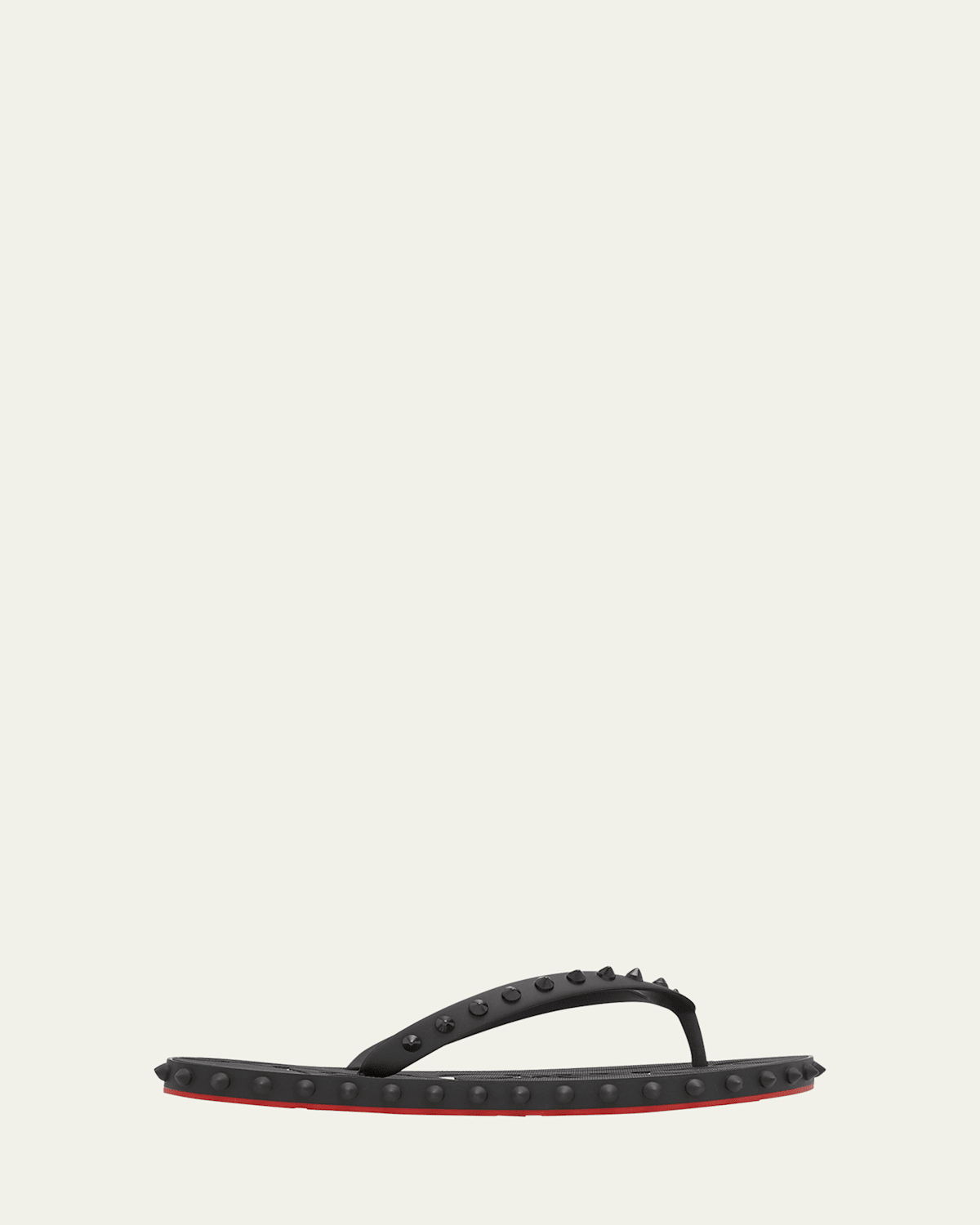 Christian Louboutin "Loubi" rubber studded flip flops. Flat heel. Spiked thong strap and midsole. Slide style. Lightweight, sturdy rubber outsole. Signature Louboutin red sole. Made in Italy.