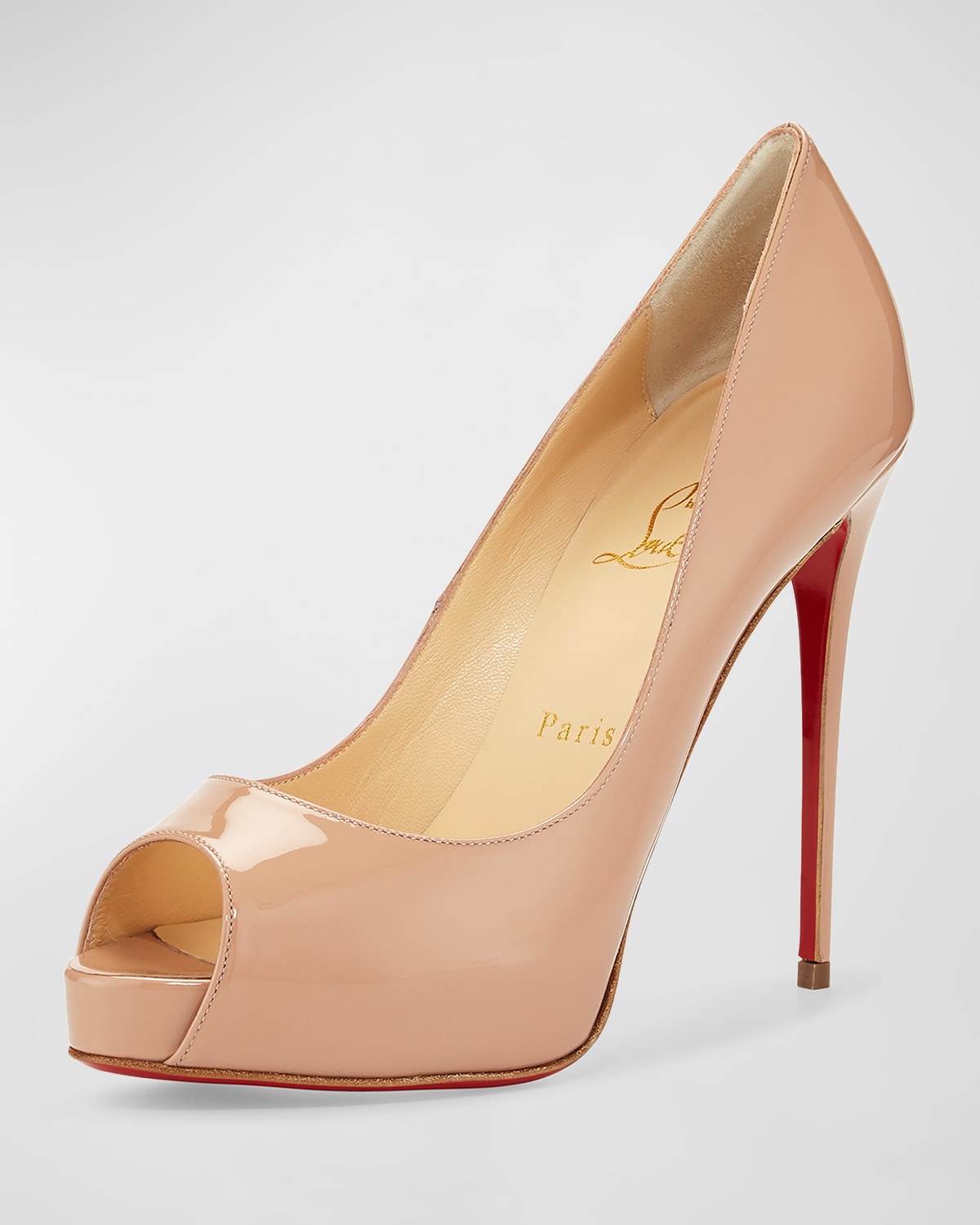 Christian Louboutin patent leather pump. 5" covered stiletto heel. 3/4" red platform; 4 1/4" equiv. Peep toe with lowdipped vamp. Leather lining and padded footbed. Signature red leather outsole. "Very Prive" is made in Italy.