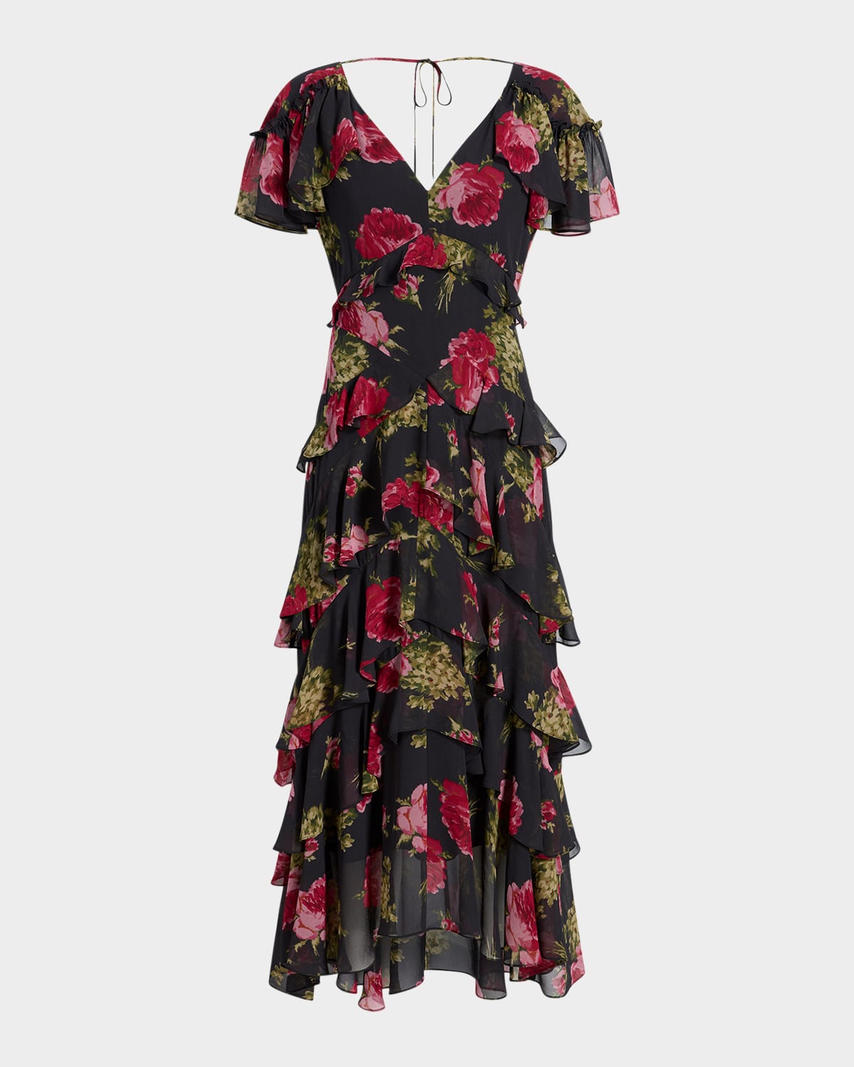 Cinq à Sept "Baroque Roses Tatum" dress channels romanticism with a floral pattern and tiered ruffles Approx. 50"L from shoulder to hem V neckline; selftie straps at rear collar Short sleeves Tea length Aline silhouette Concealed zip closure Polyester Dry clean only Imported