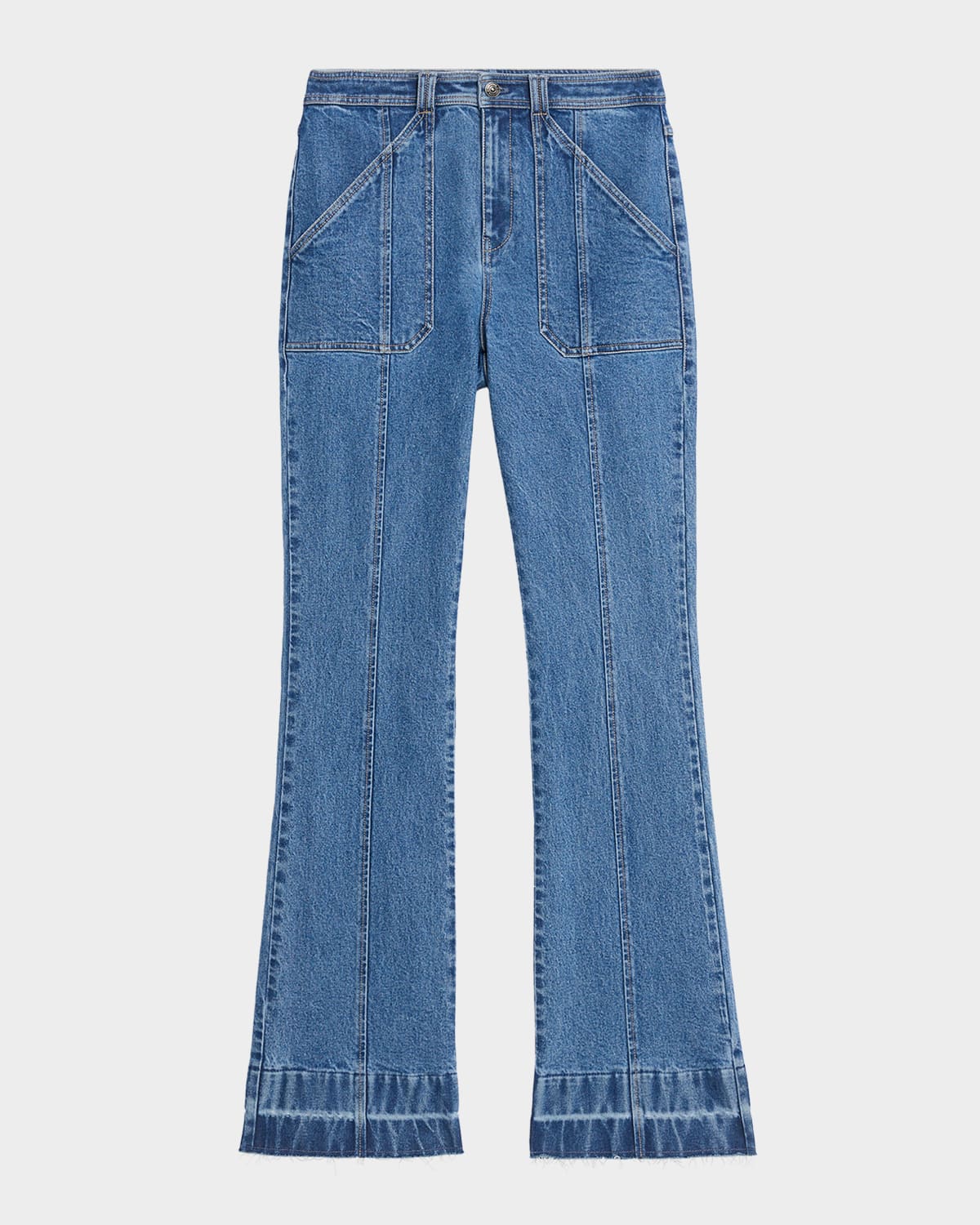 Cinq a Sept "Briella" seamed flare jeans finished with a released hem Approx. 11.3" rise; 34" inseam High rise Front slip pockets Slim fit Full length Button/zip fly; belt loops Cotton/spandex Machine wash cold, inside out Imported
