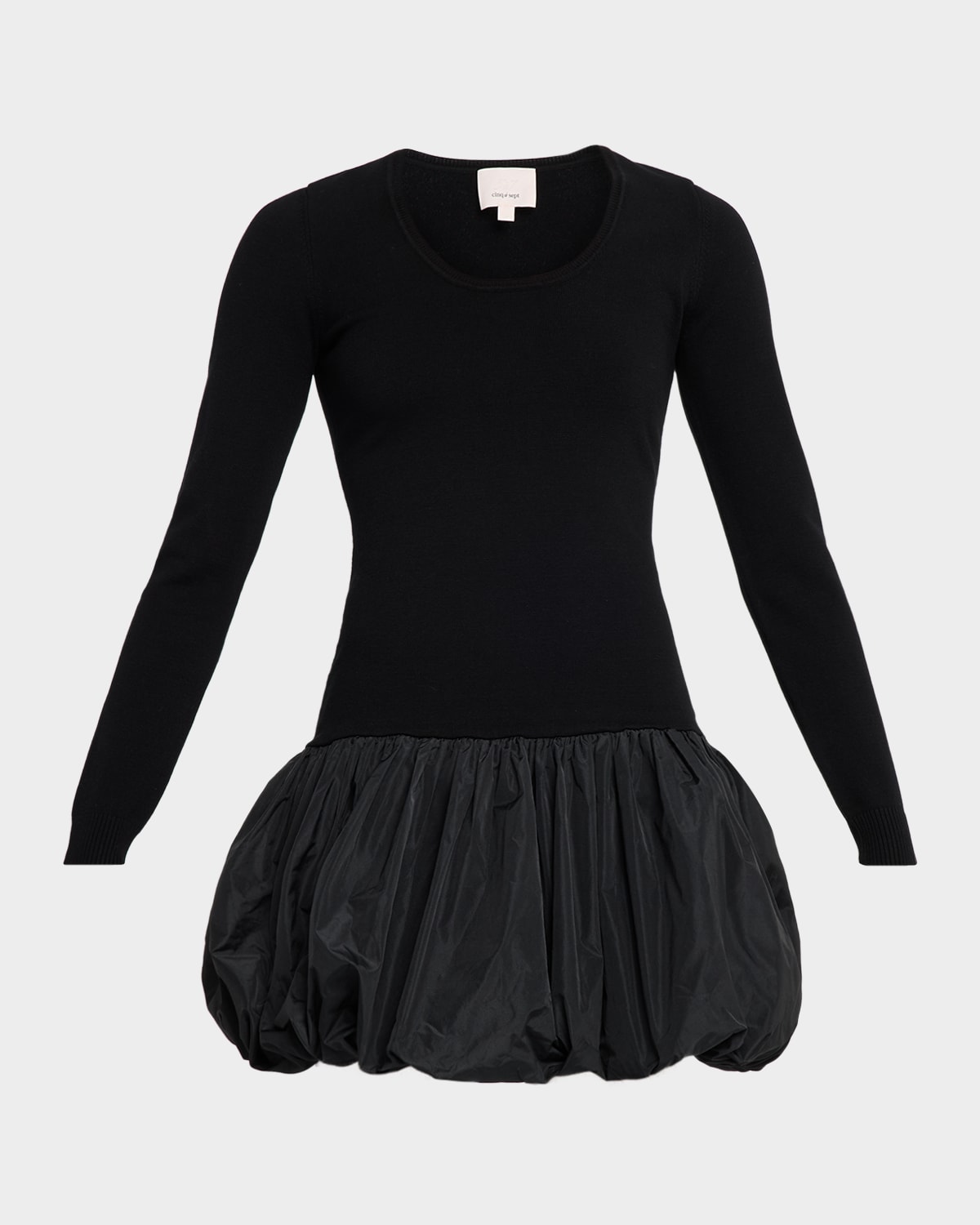 A mixedmedia silhouette, the "Brisa" mini dress by Cinq á Sept fuses a knit bodice with a bubble skirt for a stylish, monochromatic look. Scoop neckline Long sleeves Dropwaist silhouette Hem falls above the knee Slipover style Viscose/polyester Dry clean Imported