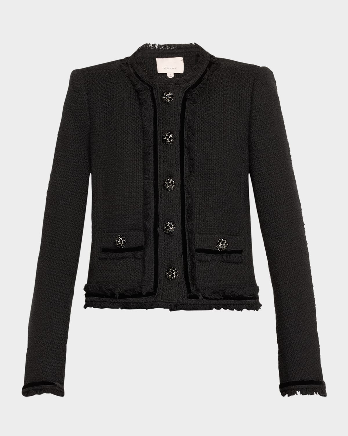 Cina à Sept "Christie" boucle jacket featuring fringe trim Round neckline Long sleeves with button cuffs Buttoned patch pockets Tailored fit Hem sits at the hip Buttonfront Cotton Lining: Polyester Dry clean Imported