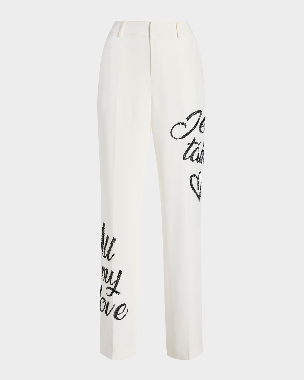 Cinq à Sept "Collins" drapey crepe pants feature crushed sequins that form French script across the fabric, creating a unique standout piece refined with sparkle Approx. 33" inseam High rise Front slip pockets Full length Straight legs Button/zip fly Triacetate/polyester Dry clean only Made in Japan