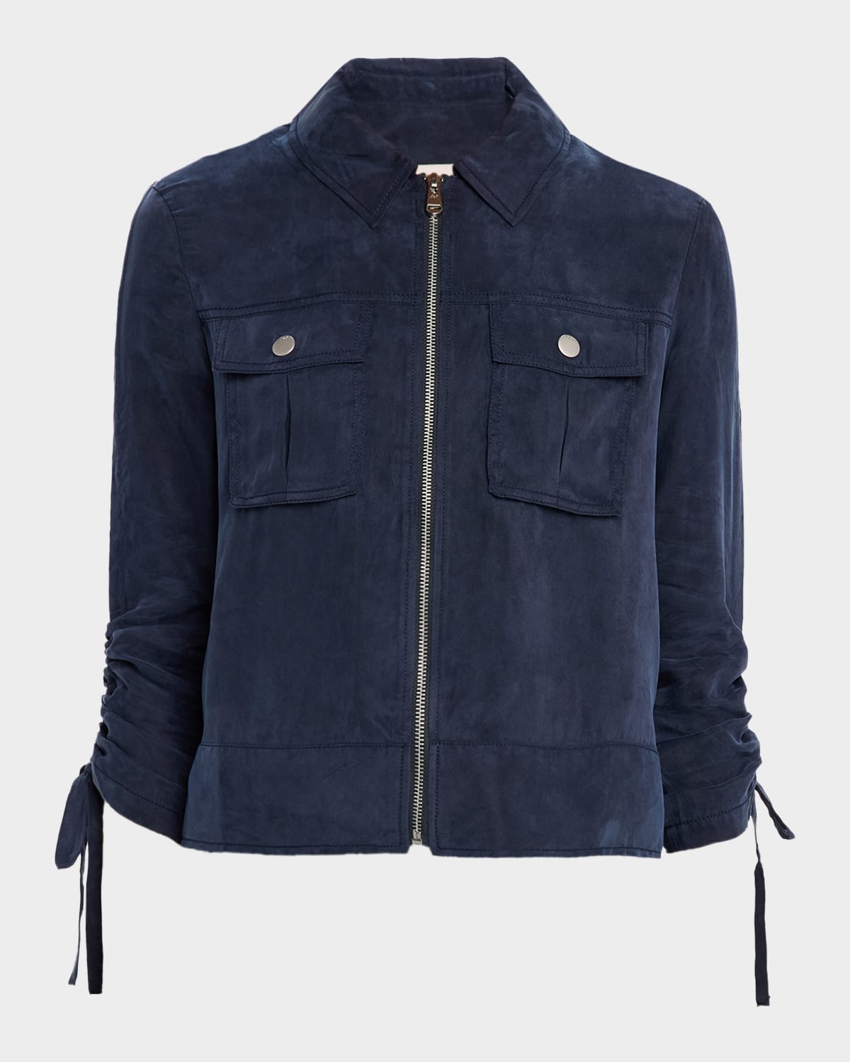Cinq á Sept "Dale" jacket crafted in soft washed twill with adjustable tie sleeves Point collar Ruched sleeves Dual chest pockets Boxy fit Hem sits at the hip Zipfront Tencel® lyocell/viscose Dry clean Imported