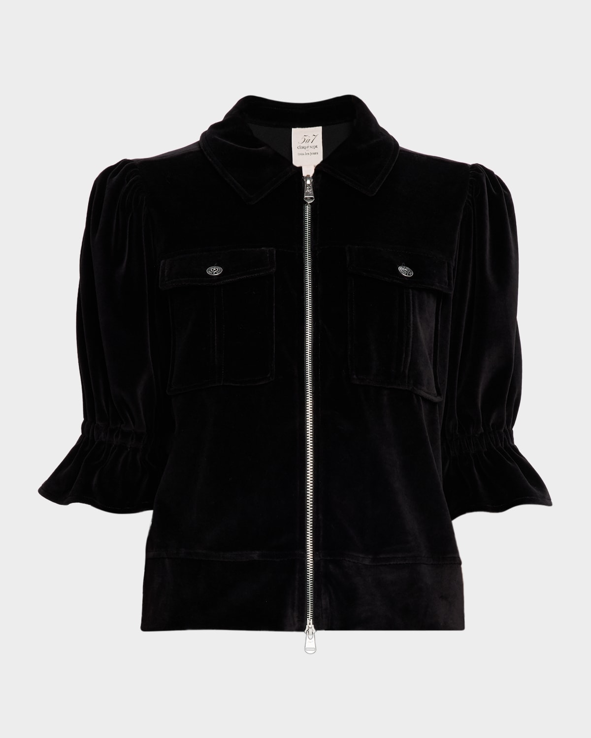 Crafted in soft velour, the "Holly" jacket by Cinq á Sept features elbowlength sleeves with ruffled cuffs for a combination of comfort and style. Spread collar; twoway zipfront Dual chest pockets Classic fit Hem sits at the hip Cotton/polyester Dry clean Made in Peru