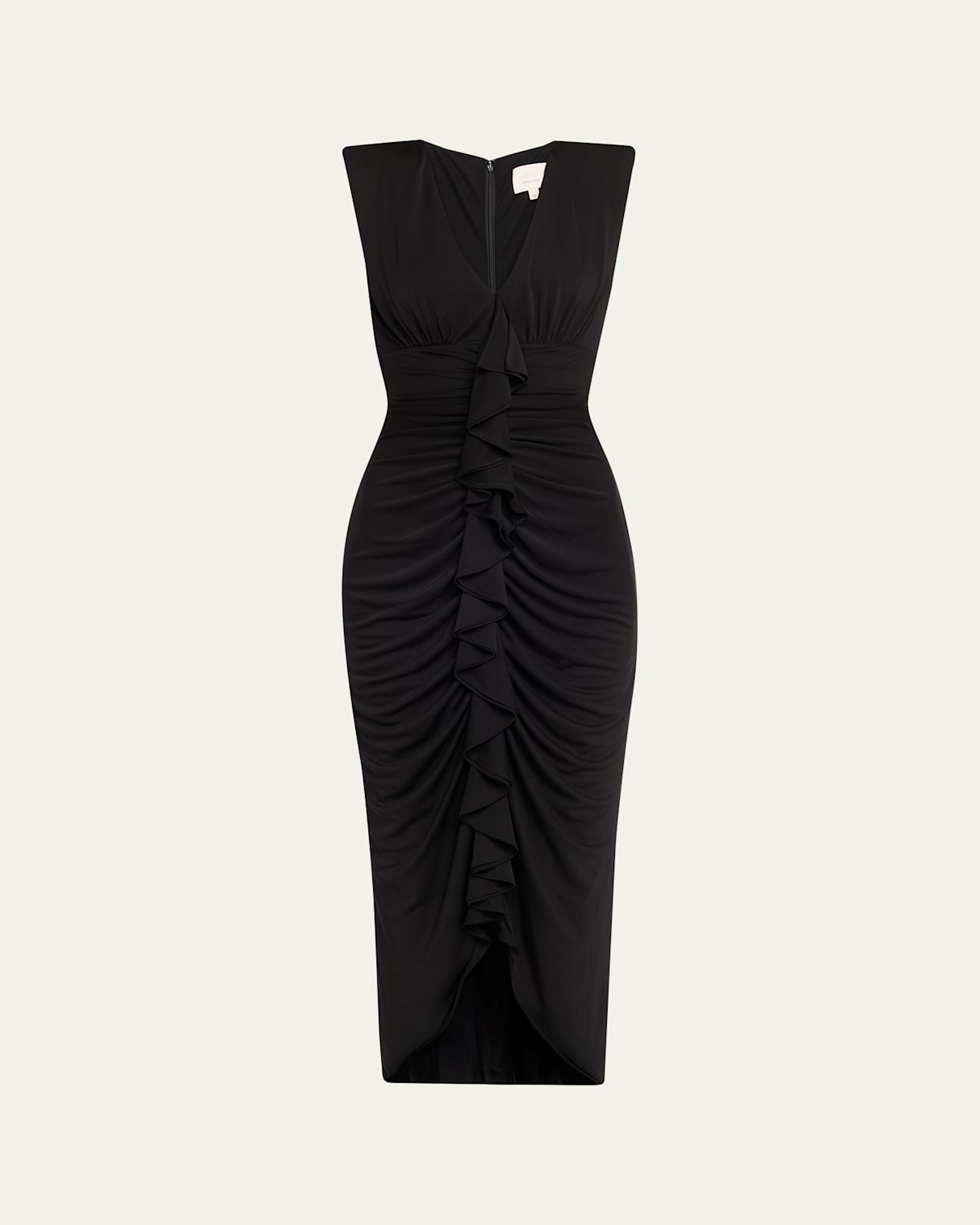 Adorned with ruching down the center front, lightlypadded shoulders, and a cutaway hem, the "Jed" dress by Cinq a Sept offers a flattering, elegant silhouette Approx. 38.3"L from shoulder to hem Lowcut V neckline Sleeveless Tulip hem falls below the knee Bodyskimming silhouette Concealed back zipper closure Polyester/spandex Lining: Polyester Dry clean Imported