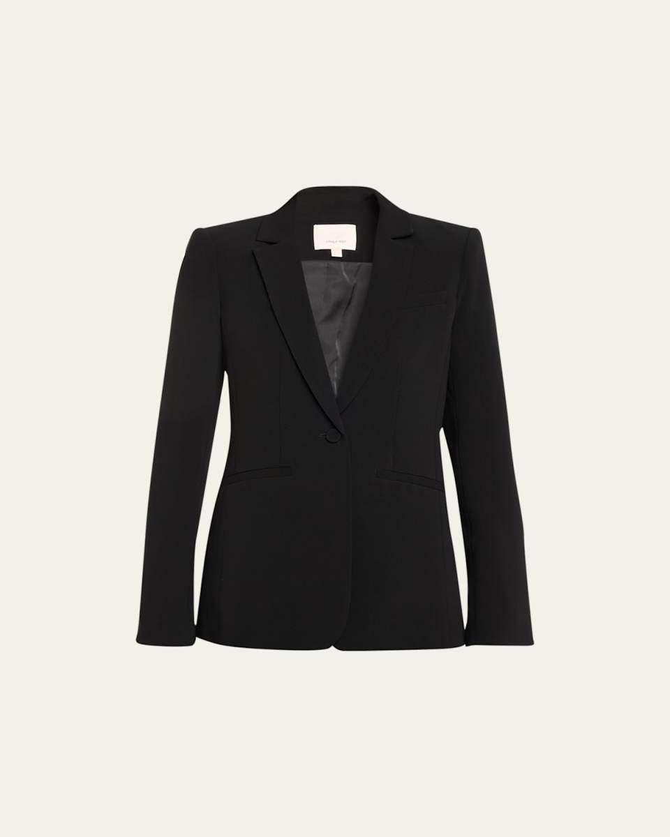 Cinq à Sept "Karlie" crepe blazer tailored with a back vent and cutaway hem Approx. 28"L from shoulder to hem Peak lapels; onebutton closure Long sleeves; approx. 24.0"L Fourbutton cuffs Chest welt pocket, front welt pockets Slim fit Hip length Triacetate/polyester Lining: Polyester Dry clean Imported