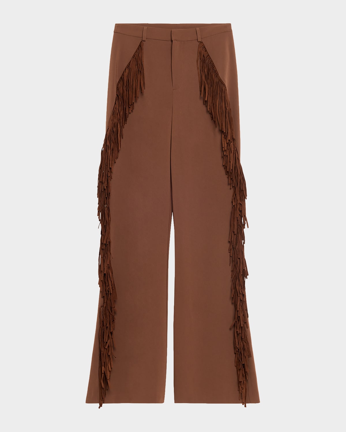 An elevated trouser, the "Keo" pants by Cinq a Sept are adorned with tonal cascading fringe trim for a Westerninspired design Approx. 34" inseam; 45" outseam High rise Back welt pockets Full length Straight legs Hidden hook/zip fly; belt loops Triacetate/polyester Lining: Polyester Dry clean Imported