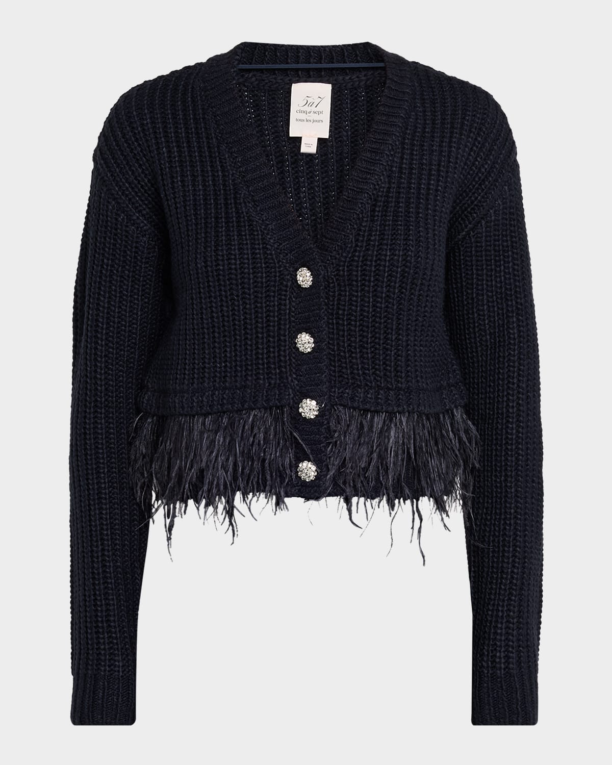 Accented with tonal feather trim, the "Krissi" cardigan by Cinq a Sept is designed in a chunky ribbed knit with jewelry buttons for an elevated look V neckline Dropped shoulders Long sleeves Classic fit Hip length Button front closure Acrylic/feather Imported