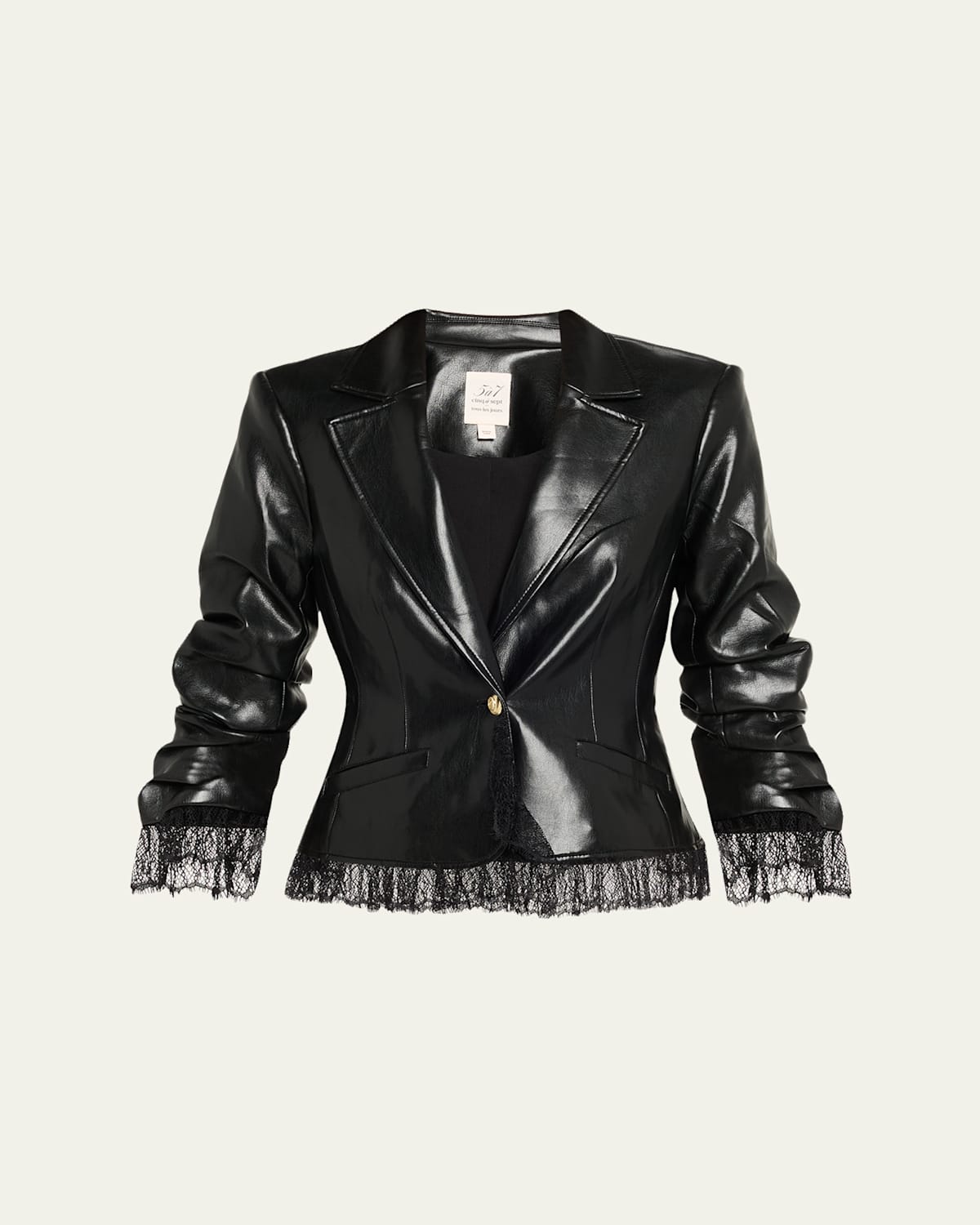 Trimmed with tonal feminine lace, this blazer by Cinq a Sept Vegan is crafted from contrasting smooth vegan leather (PU) Approx. 21.8"L from shoulder to hem Notched lapels; singlebreasted front Long sleeves; button cuffs Angled welt pockets Tailored fit Midlength Polyurethane/viscose Unlined Dry clean Imported