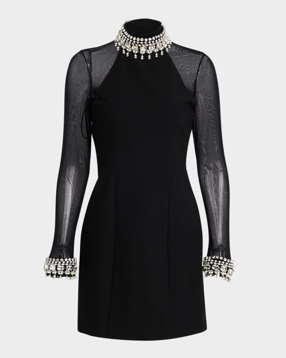 Cinq á Sept "Loretta" mesh mini dress featuring pearlembellished trim Turtleneck Long sleeves Bodycon silhouette Hem falls above the knee Invisible back zip Polyester/viscose/elastane Lining: Polyester Dry clean Imported