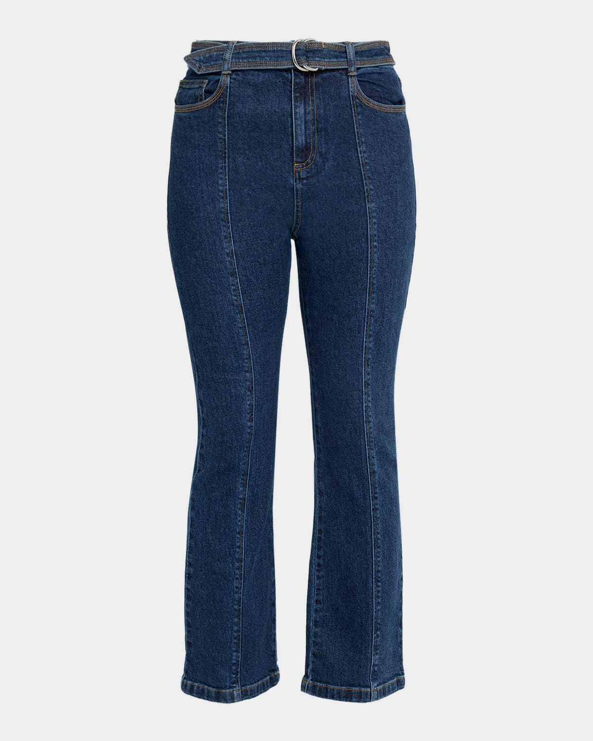 Cinq á Sept "Madi" seamed denim pants finished with a matching Dring belt Approx. 11.5" rise; 27.5" inseam High rise Fivepocket style Slim, flared legs Ankle length Button/zip fly; belt loops Cotton/spandex Machine wash cold, inside out Imported