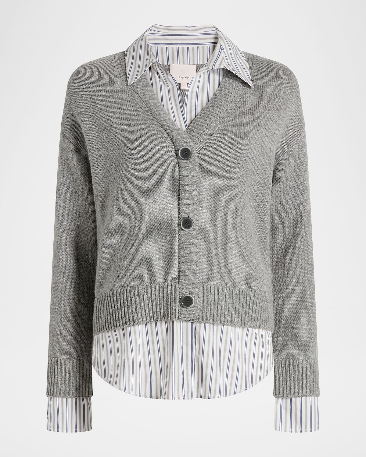 A combo piece that will elevate any look, the "Megan" pullover by Cinq á Sept is prestyled with a cashmereblend cardigan and finished with a cotton poplin shirt. Spread collar; V neckline Long sleeves with button cuffs; approx. 27.5"L Relaxed fit Hem falls to the hip Buttonfront Cashmere/wool/cotton Unlined Dry clean Imported