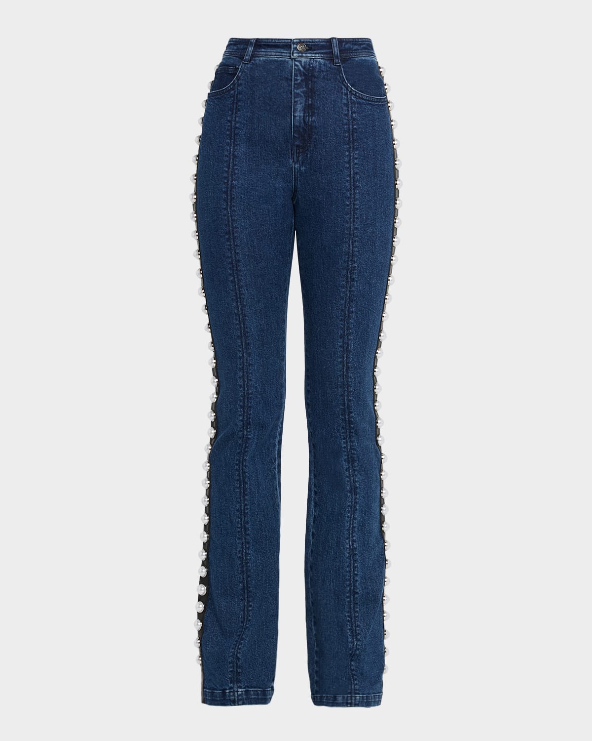 Cinq á Sept flare jeans embellished with pearl side stripes Approx. 10.8" rise; 34" inseam High rise Fourpocket style Slim fit Full length Button/zip fly; belt loops Cotton/spandex Dry clean Imported