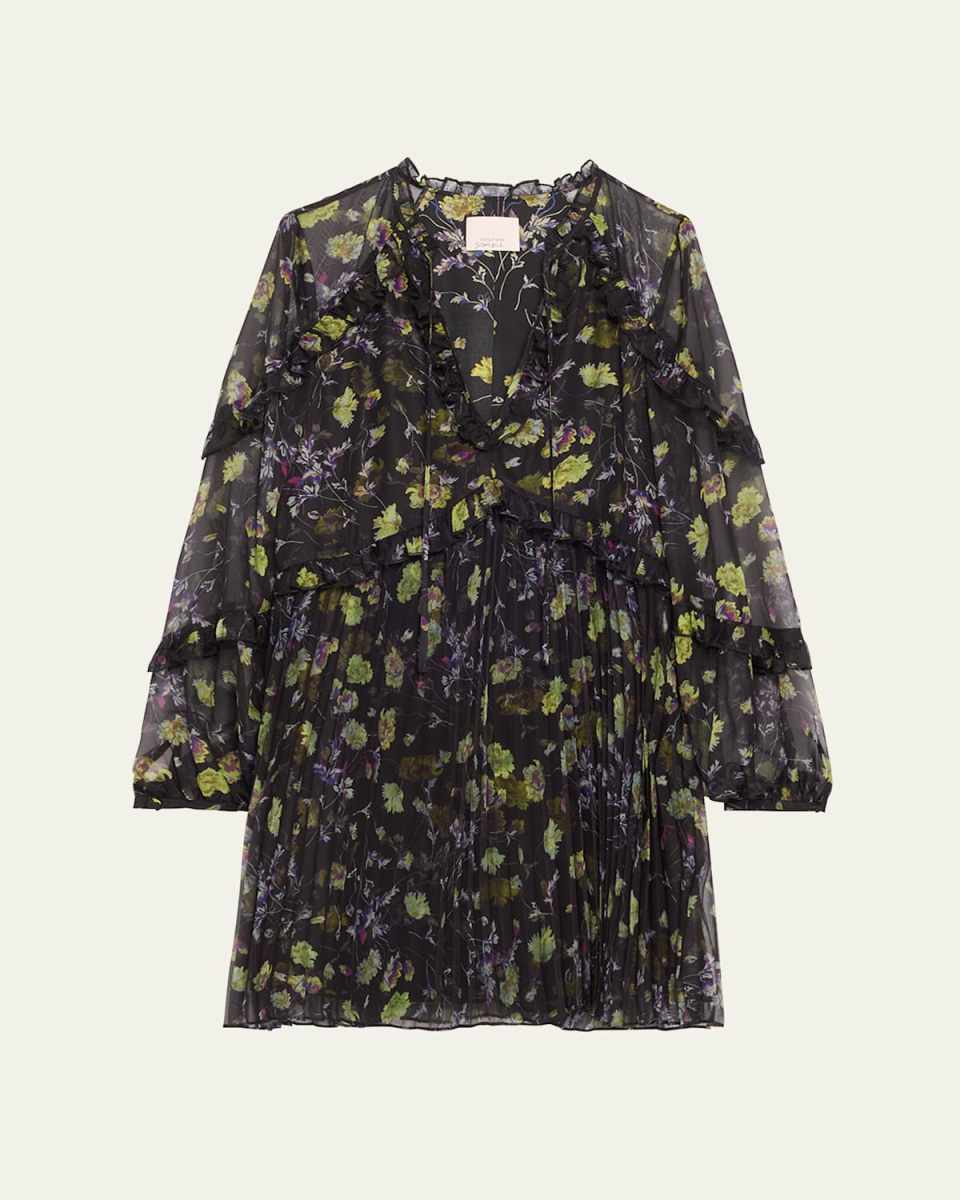 Cinq à Sept "Robin" sheer floral print mini dress featuring ruffle detailing V neckline with selfties Long sleeves with button cuffs Aline silhouette Finished with pleating Slipover style Polyester Partially lined Dry clean Imported