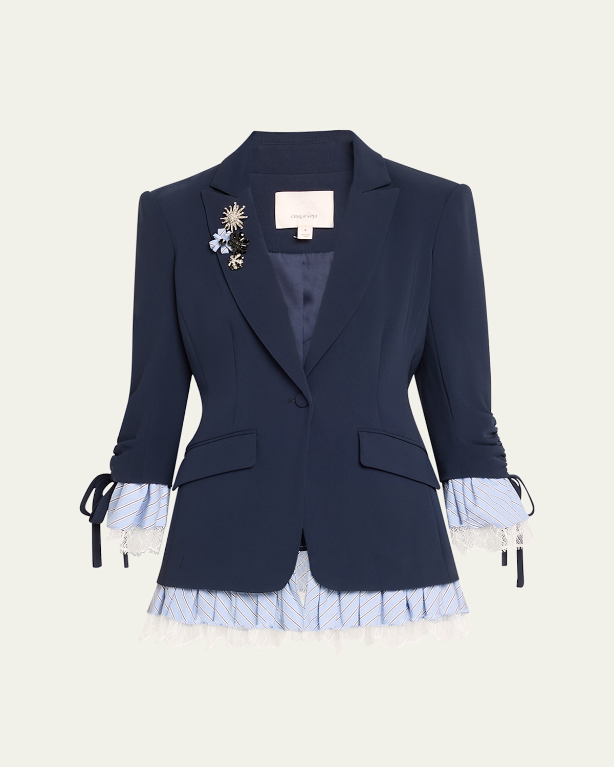Cinq à Sept "Roxie" blazer showcases brooches on the right lapel and a striped combo with lace Approx. 26.3"L from shoulder to hem Notched lapels; onebutton closure Drawstring bracelet sleeves; approx. 25.3"L Decorative faux front pockets Tailored fit Hits below the hips Triacetate/polyester Unlined Dry clean Made in Japan