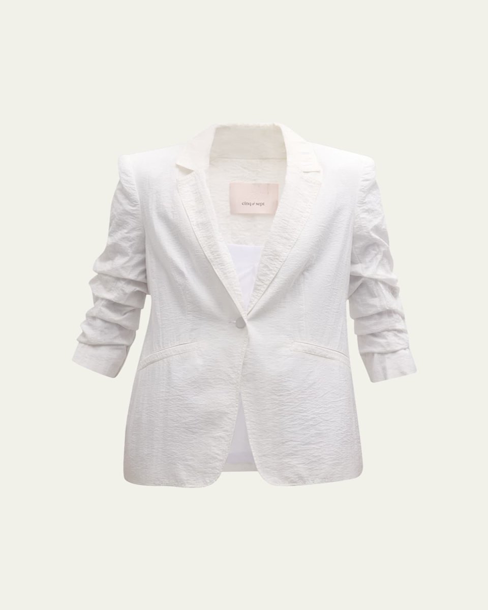 Cinq à Sept "Khloe" blazer in textural fabric Notched lapels; singlebutton closure Signature scrunched sleeves Button cuffs Front welt pockets Vented back Cutaway front Polyester Dry clean Imported