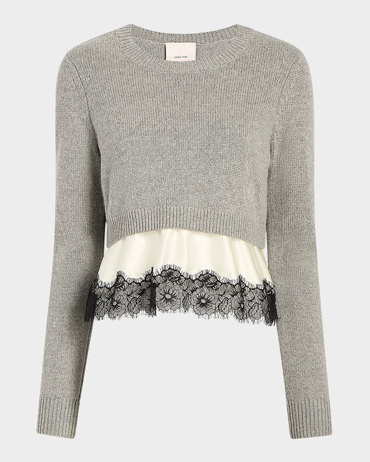 Crafted in a luxurious cashmere blend, the "Zyla" sweater by Cinq á Sept features a layered hem with lace trim for a delicate finish. Scoop neckline Long sleeves Classic fit Pullover style Cashmere/wool/cotton Dry clean Imported