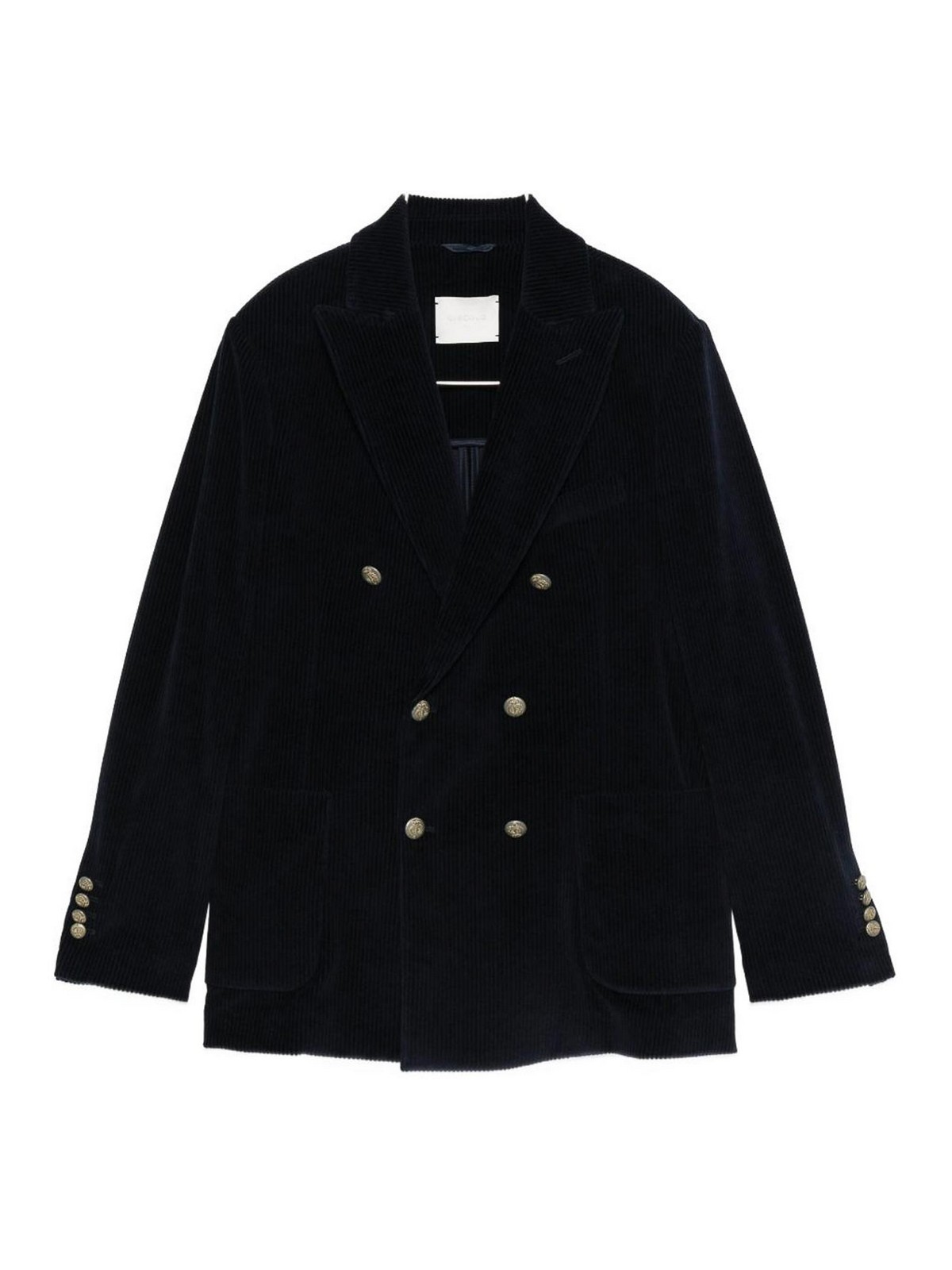 Double boutonnage en velours côtelé bleu, boutons ton sur ton, poches plaquées, manches longues