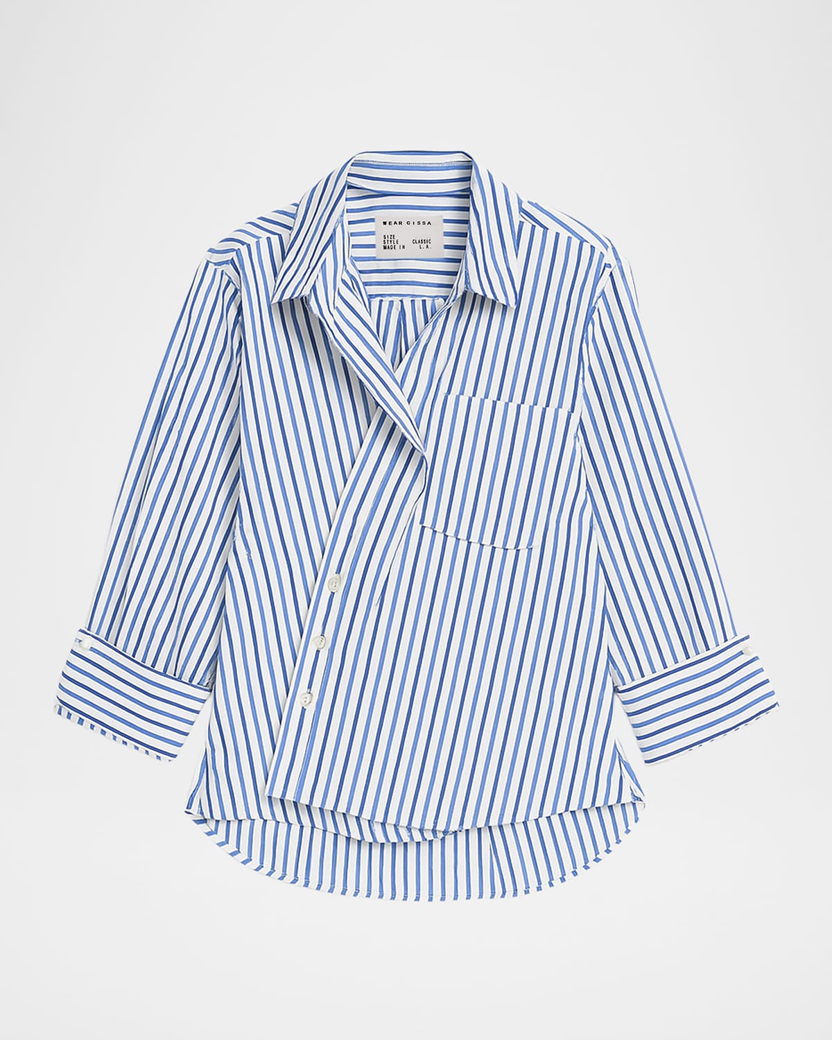 Patterned with mixed stripes, the "Overshirt" by CISSA is a pullover, wraponly shirt with an open neckline to show off your favorite jewelry or your décolletage Approx. 24.5"L from shoulder to hem Spread collar; fixed asymmetric button front 3/4 sleeves; button cuffs Yoked back Relaxed fit Hip length Egyptian cotton Dry clean, machine wash cold Made in USA from imported materials