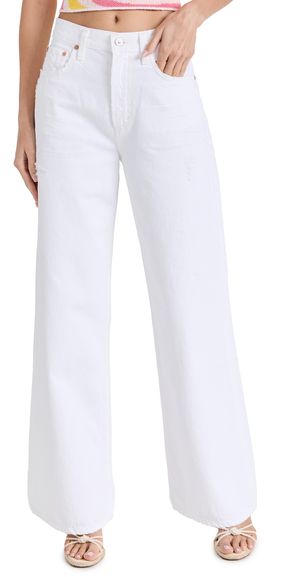 Fabric: Heavyweight, non-stretch denim. Distressed holes. Full length, wide-leg cut. Button closure and zip fly. 5-pocket styling. Shell: 100% cotton. Wash cold. Made in the USA of imported materials. Measurements: Measurements from size 26 Rise: 11.75in / 30cm Inseam: 31.5in / 80cm Leg opening: 23.5in / 60cm