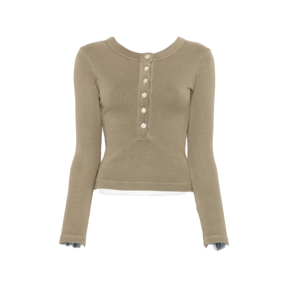 khaki green ribbed knit henley neck front button fastening long sleeves straight hem
