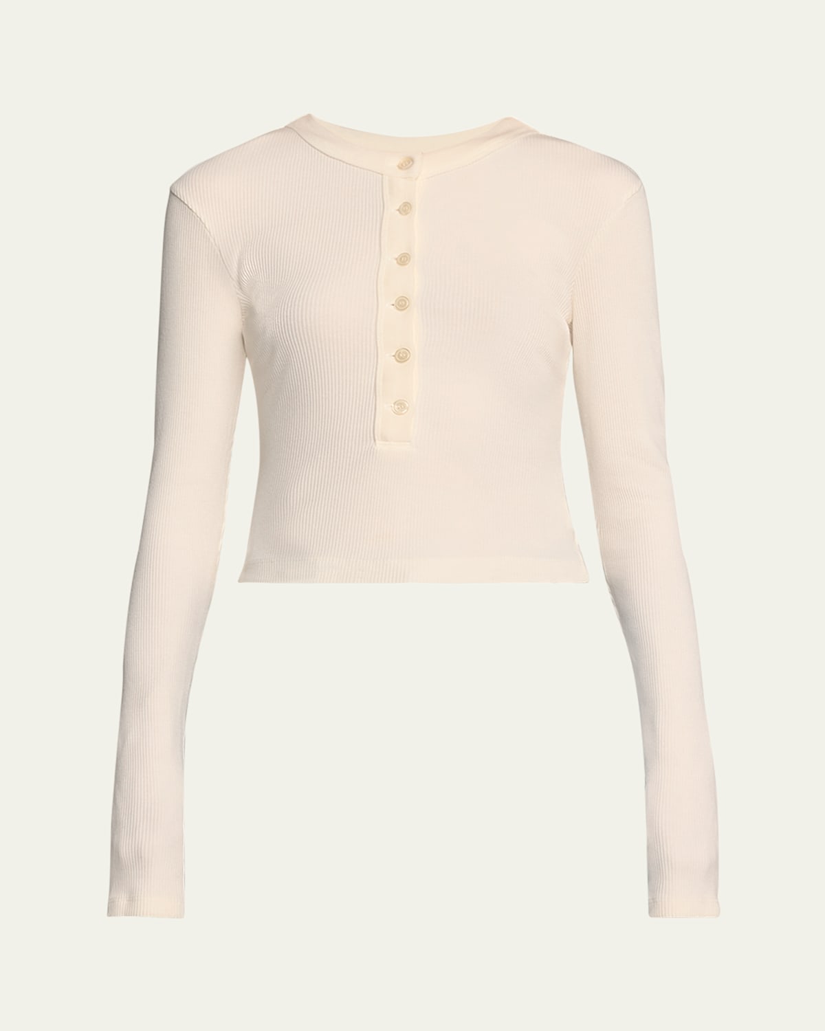 Citizens of Humanity "Varra" henley top in ribbed knit Crew neckline; buttonplacket Long sleeves Fitted Hem sits at the hip Pullover style Cotton/Tencel® lyocell/spandex Made in USA