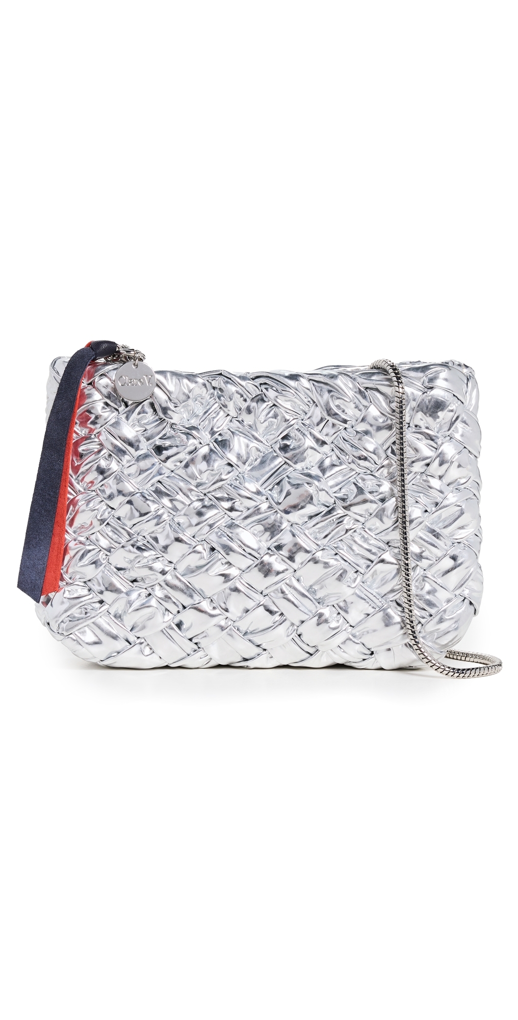 Calfskin. Woven metallic leather. Chain crossbody strap. Contrast ribbons. Magnetic closure. Lining: Textile. Weight: 17oz / 0.48kg. Imported, Bangladesh. Measurements: Height: 6in / 15cm Length: 8.25in / 21cm Depth: 2.25in / 6cm Strap drop: 21.75in / 55cm