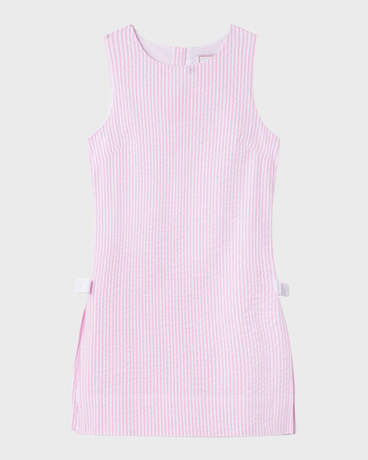 Classic Prep Childrenswear "Madison" seersucker dress with bows at sides Round neckline Sleeveless Zip closure at back Slit hems Stepin style Cotton Imported