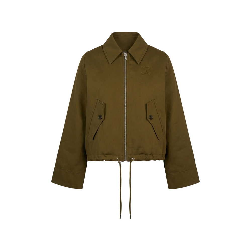 olive green point collar buttoned flap pockets zip fastening drawstring hem embroidery detail