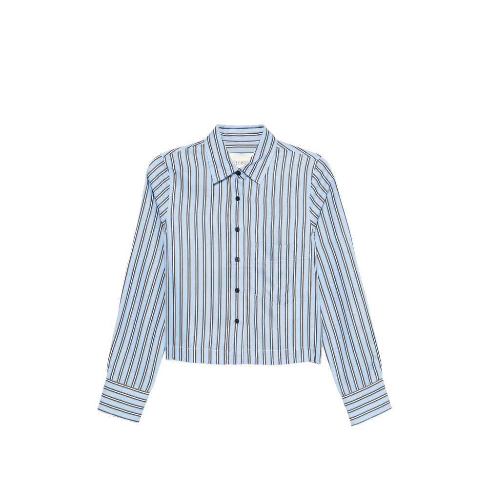 blue striped pattern chest pocket front button fastening buttoned cuffs cropped design