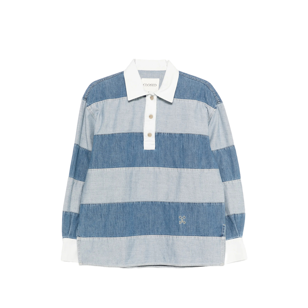 blue striped embroidered logo button fastening long sleeves polo collar
