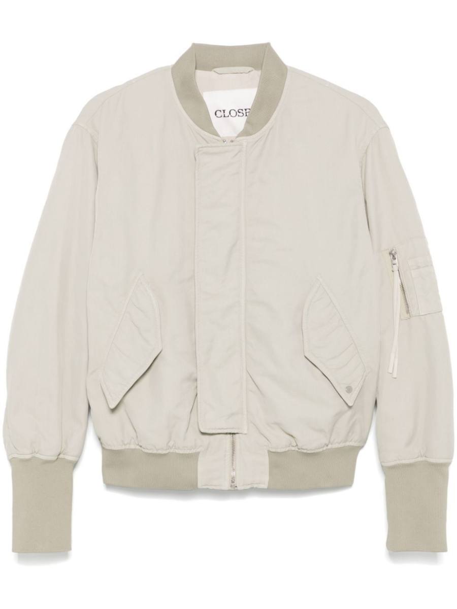 light beige recycled polyester textured finish concealed front press-stud fastening concealed front zip fastening baseball collar long sleeves sleeve zip pocket ribbed cuffs and hem two side flap pockets