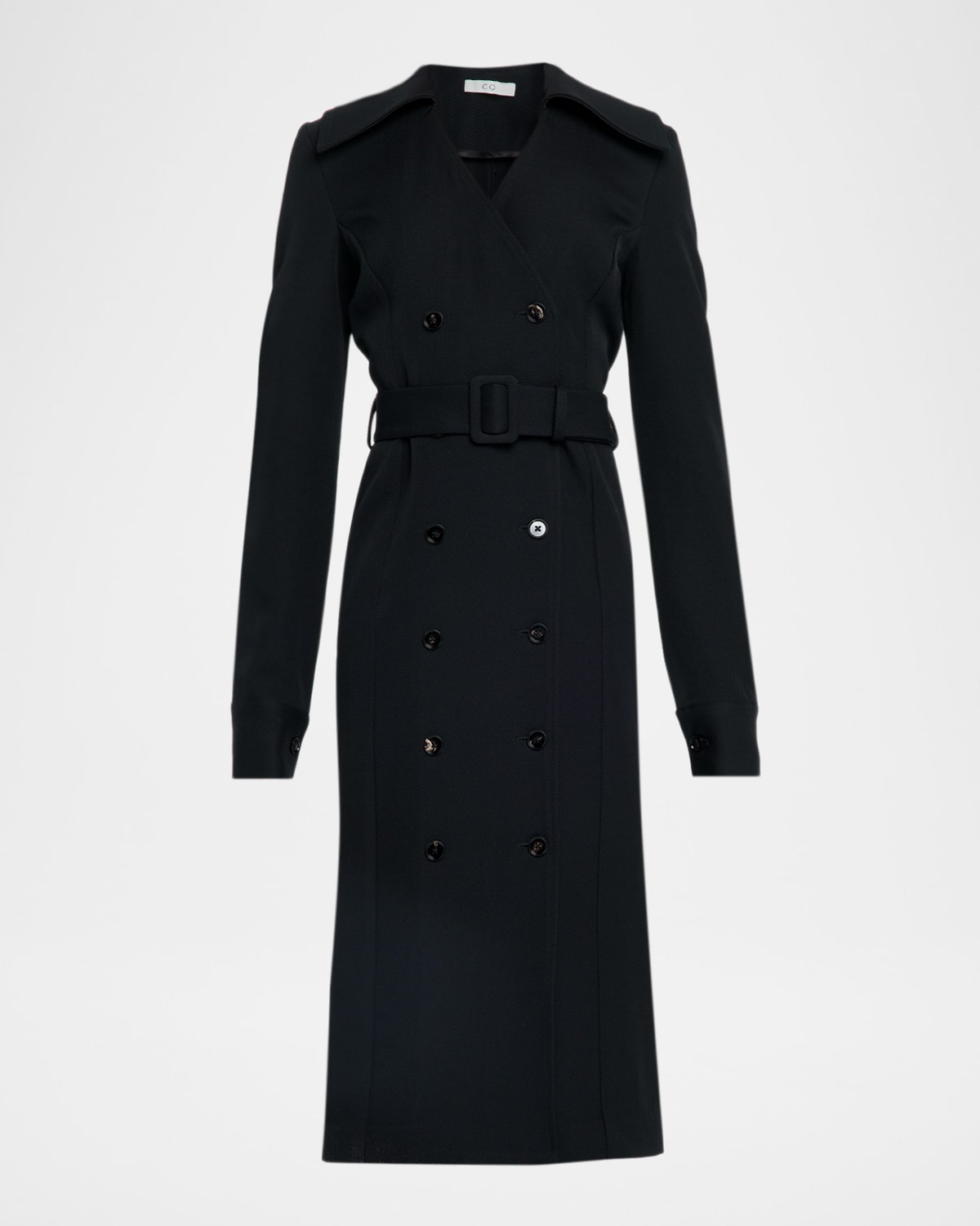 Co sartotial dress is crafted of a wool twill featuring slimming princess darts and is cinched at the waist with a self belt Spread collar, V neckline; doublebreasted front Long sleeves; banded cuffs Belted waist Sheath silhouette Hem falls below the knee Virgin wool Imported