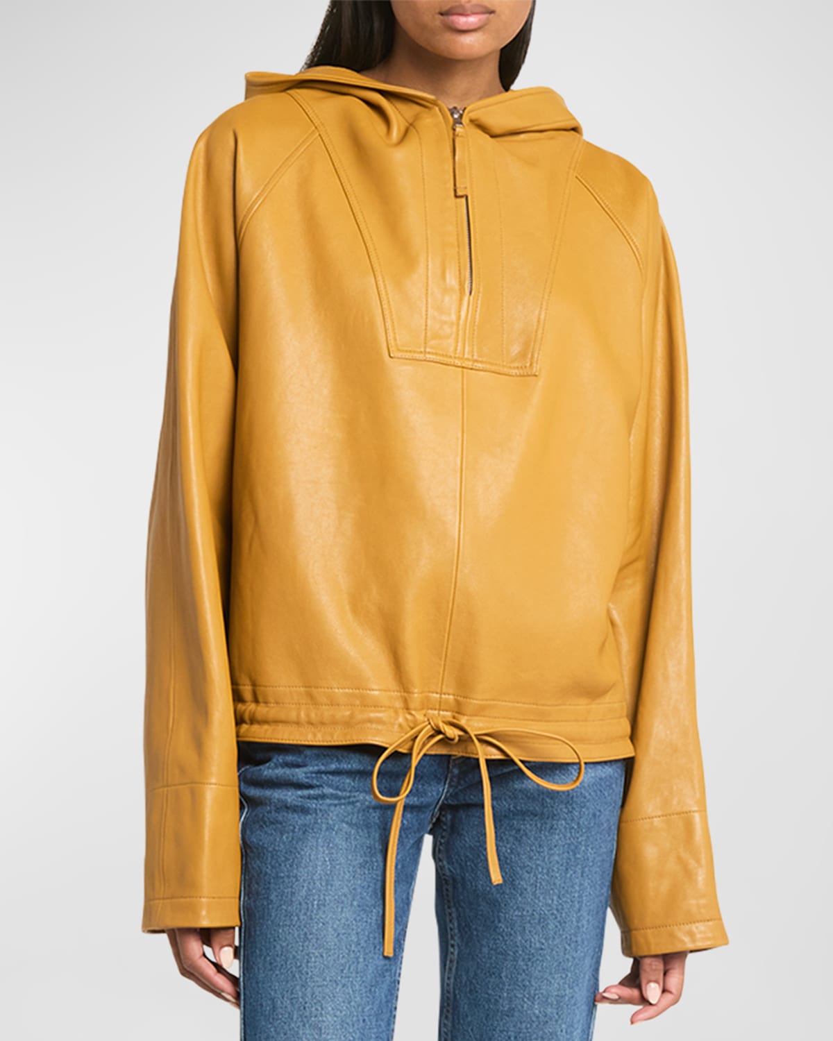 Co workwear pullover in lambskin leather Hooded neckline; quarterzip front Long raglan sleeves Loose fit Drawstring hem Pullover style Imported
