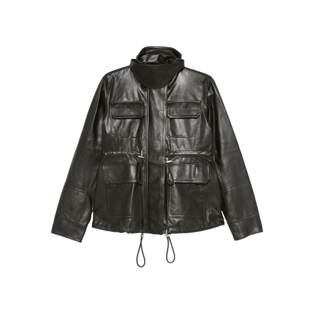 chocolate brown stand-up collar front concealed fastening four front flap pockets drawstring hem long sleeves
