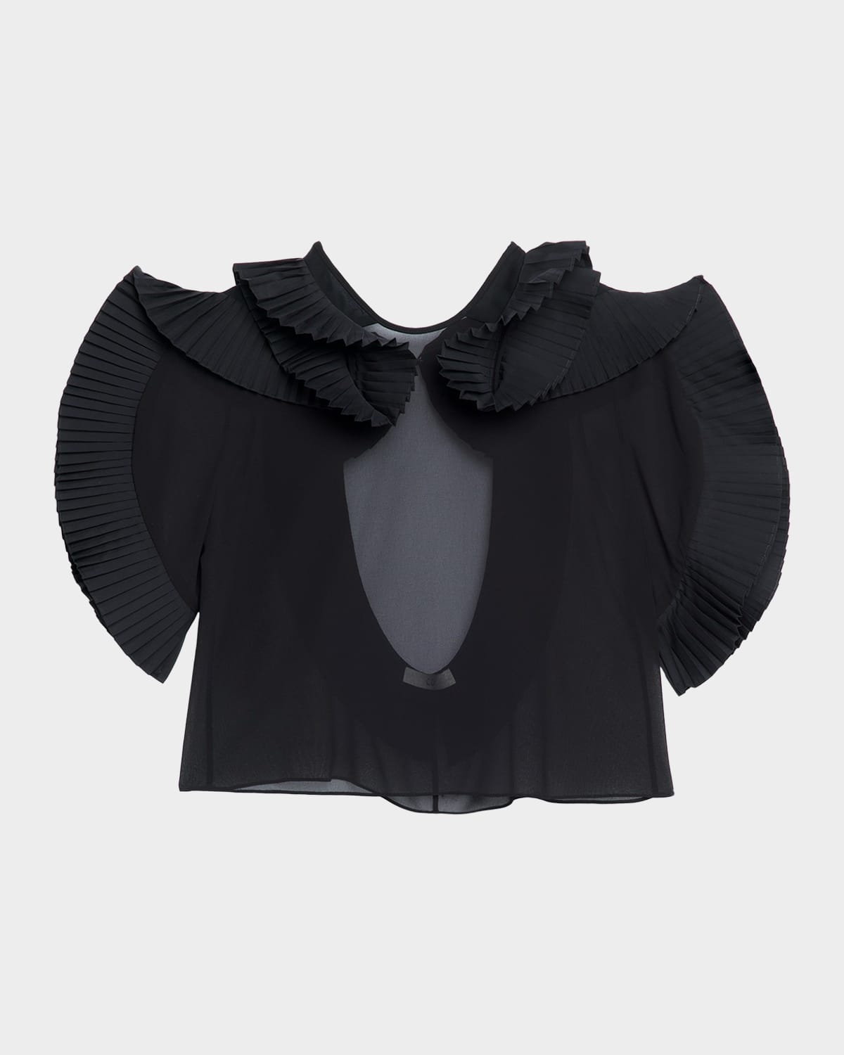 Co top is crafted of sheer chiffon featuring a keyhole back cutout embellished with sculptural plisse ruffles Stand collar; hook/keyhole back Short sleeves Relaxed fit Hip length Pullover style Polyester Imported