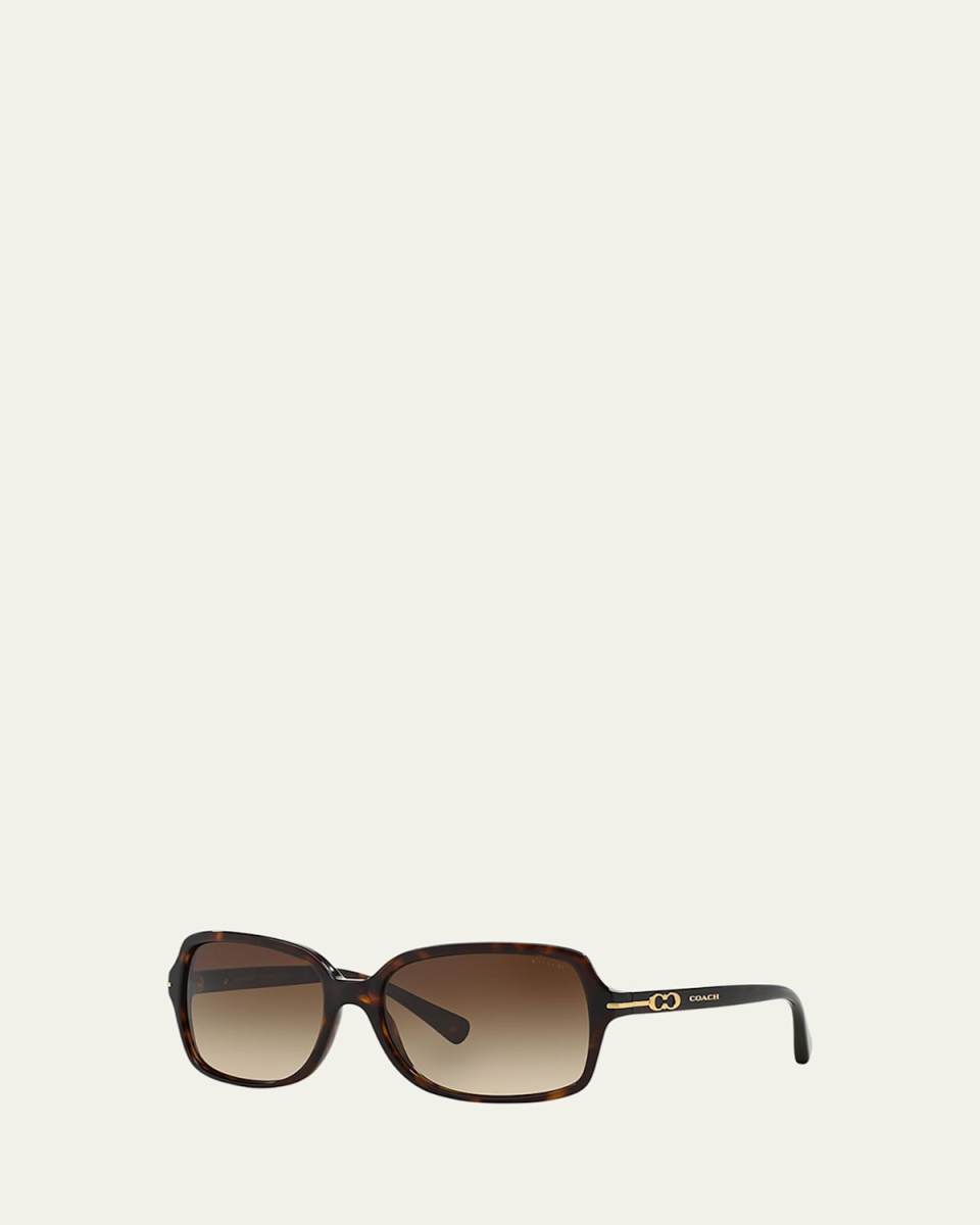 Coach rectangle sunglasses in acetate. Monochromatic lenses. Golden logo hardware through temples and hinges. 100% UVA/UVB protection. Imported.