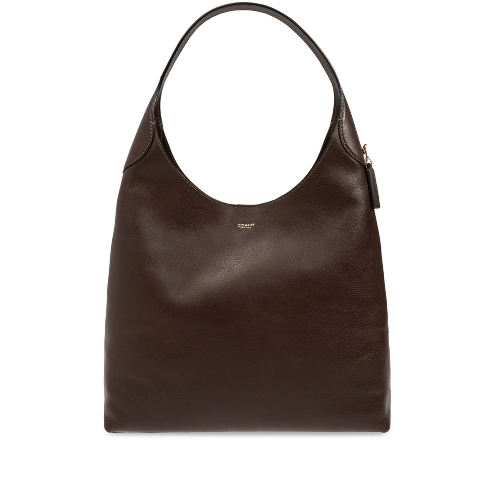 brown natural grain leather top handle magnetic snap fastening gold logo snap-buttoned pocket