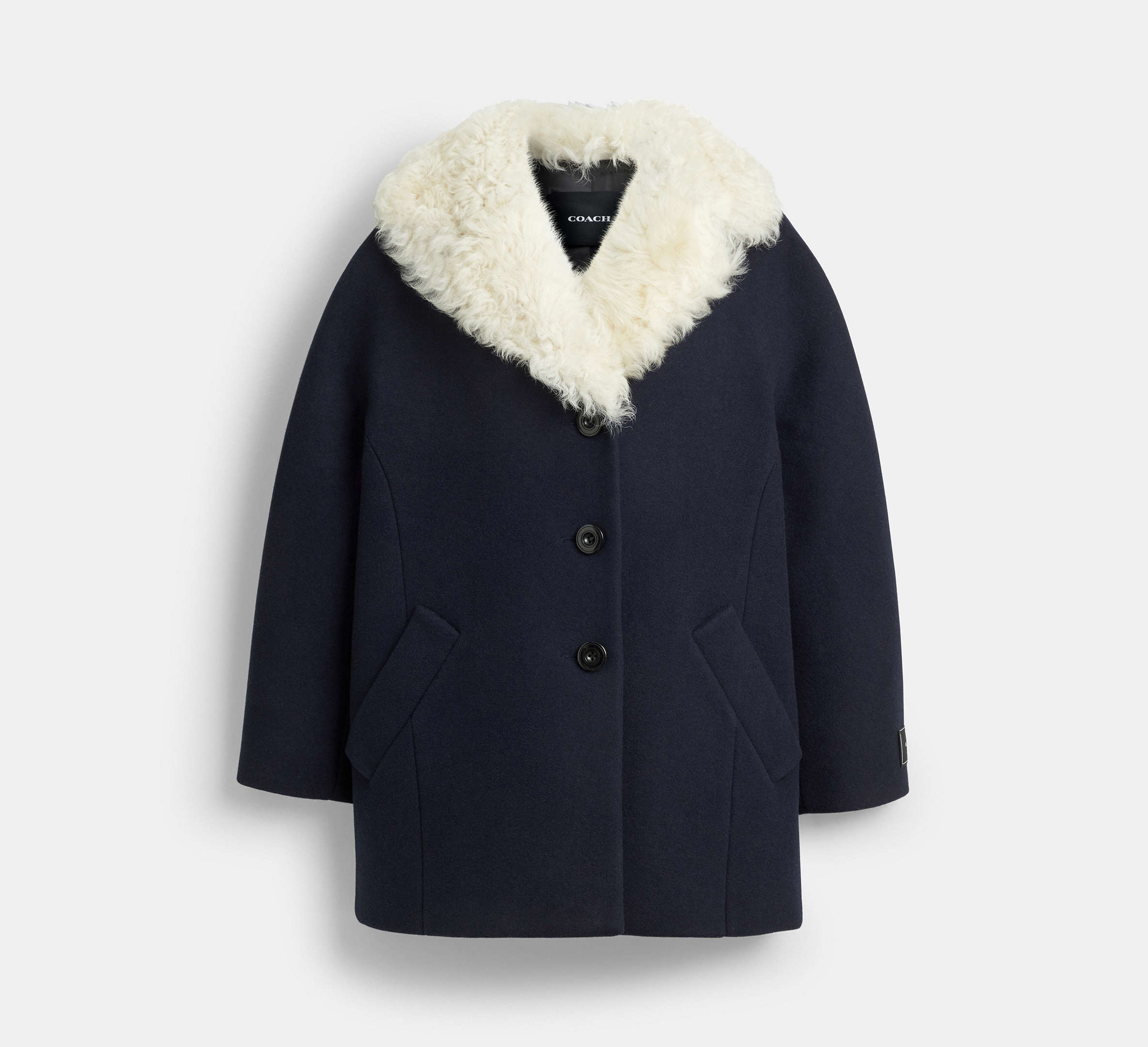 An elevated style for day or night, this single-breasted wool-blend coat is finished with a luxuriously soft shearling collar. The classic-fit silhouette features flap pockets, a back vent for added mobility and our Coach tailored label at the cuff.