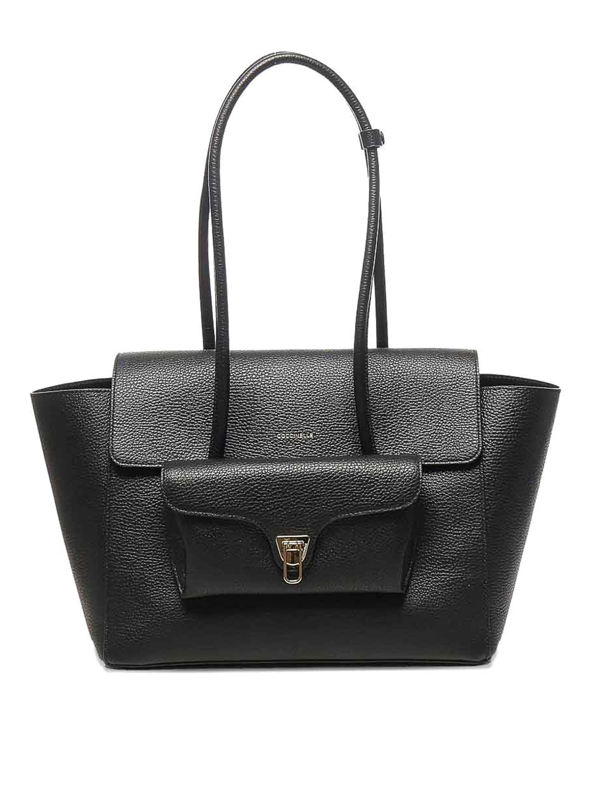 Poche à rabat noire, fermoir ton sur ton, longues anses supérieures, silhouette trapèze