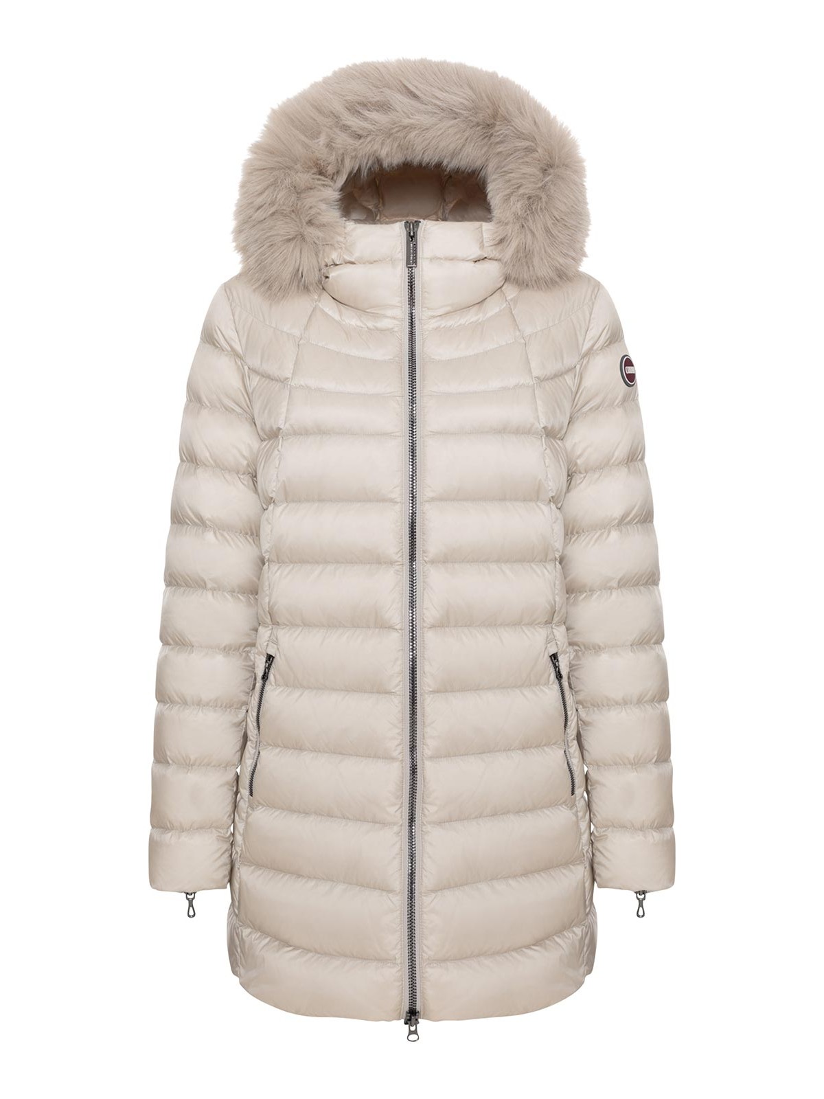 Veste de luxe en oie imperméable et respirante avec fermeture éclair à double curseur, capuche fixe à réglage réglable et fourrure synthétique coulriccia amovible pour faciliter l'entretien de la tête des poches latérales avec fermeture éclair, poignets Colmar Originals appliqués sur la gauche, patch C appliqué sur le dos, instructions pour la voiture, à Max Gradi, ne pas utiliser de javel, sèche-linge, basses températures, ne pas repasser, sécher non autorisé