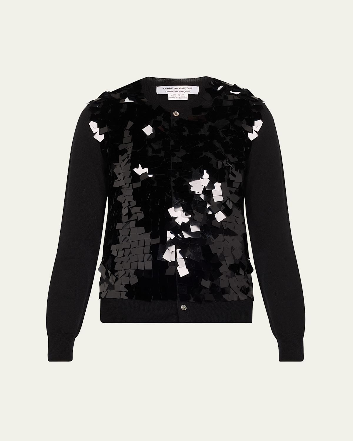 Comme des Garcons, Comme des Garcons knit cardigan with front sequin embellishment Crew neckline; button front Long sleeves Slim fit Wool Made in Japan
